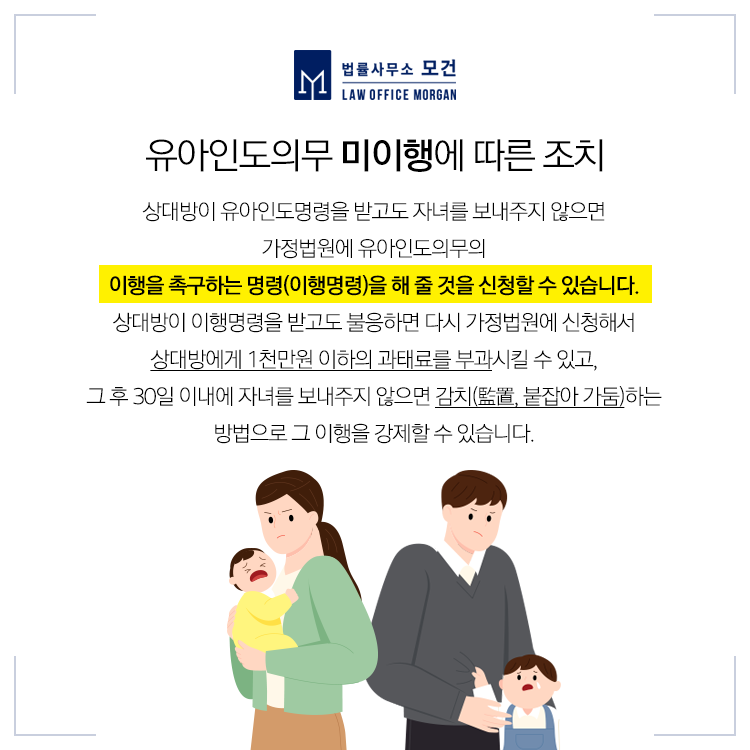 이때 양육자는 '유아인도심판청구'를 진행하여 법원의 심판으로 법적효력을 갖게 될 수 있고, 그럼에도 자녀를 인도하지 않을 시에는 이행명령, 과태료부과, 감치, 강제집행 등으로 대응하실 수 있습니다.