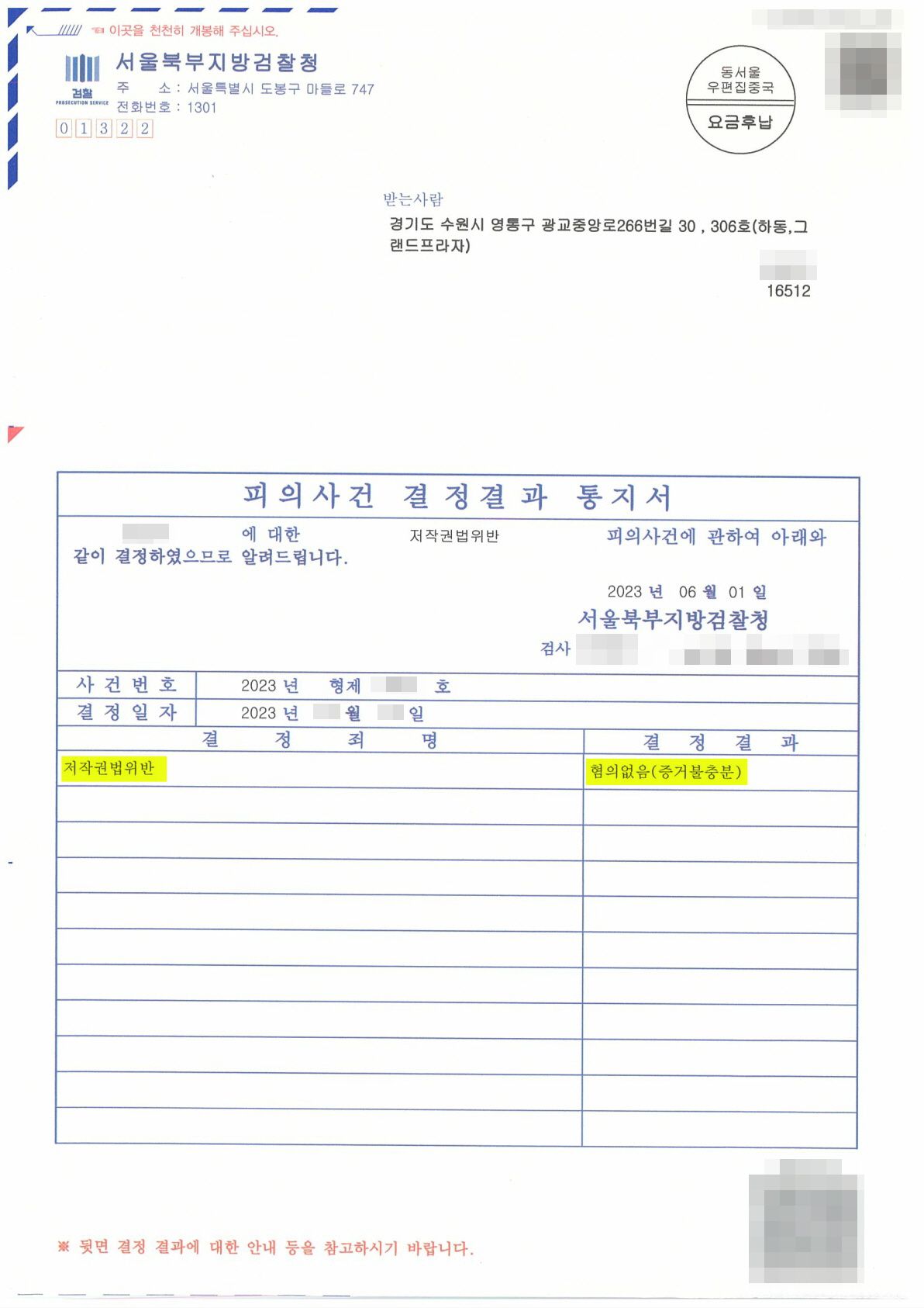 - 이 사건은 검찰로 송치되며 안변과 의뢰인을 걱정시켰습니다. 그러나 다행히도 경찰과는 달리 검찰에서는 안변의 주장을 전부 받아들여 혐의없다는 이유로 불기소 결정을 하였습니다.