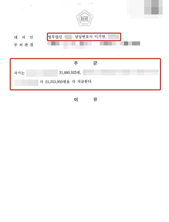 재판부에서도 이러한 점을 수용하였으며 최종적으로 의뢰인께서 청구한 보상금액을 각자의 상속비율로 수령하게 되었습니다.