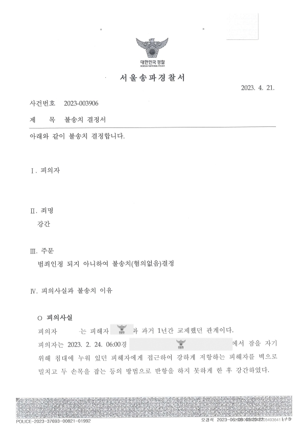 위 건은 무혐의로 사건이 종결 되었다 하더라도 상대를 무고로 고소하여 처벌시키기는 어려운 사건이기도 하고, 피의자가 전 여자친구이기도 했었던 고소인을 무고로 고소하는 것은 원하지 않기에, 불송치로 사건을 마무리하는 것으로 만족 하였습니다.