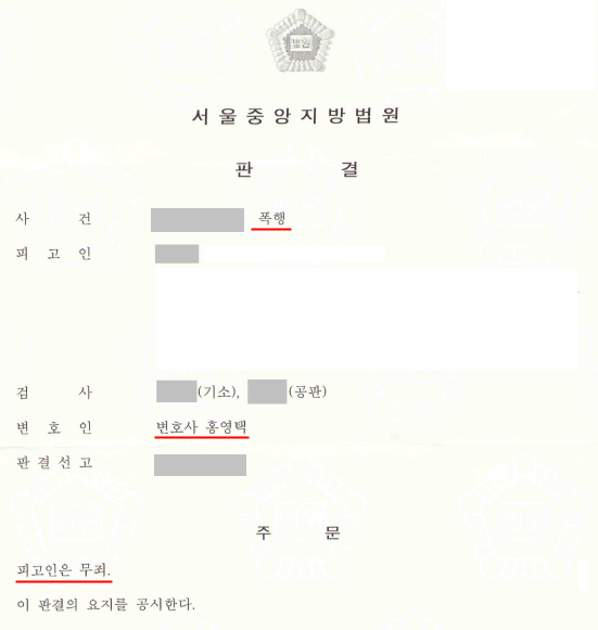 법원은 ① 증거로 제출된 블랙박스 영상을 모두 보더라도 @@:@@경 외에 피고인이 피해자를 밀쳤다고 볼 만한 부분이 없고, ② 피고인이 피해자를 밀쳤다고 인정할 만한 장면은 @@:@@경 블랙박스에 녹화된 것이 유일한데, 이는 피고인의 가슴과 목 부위를 양손으로 밀치는 피해자에 대항하여 한손으로 피해자의 가슴 부위를 살짝 밀친 것에 불과하여 형법상 폭행죄에 해당한다고 보기 어렵다하여 피고인에게 무죄를 선고하였습니다.