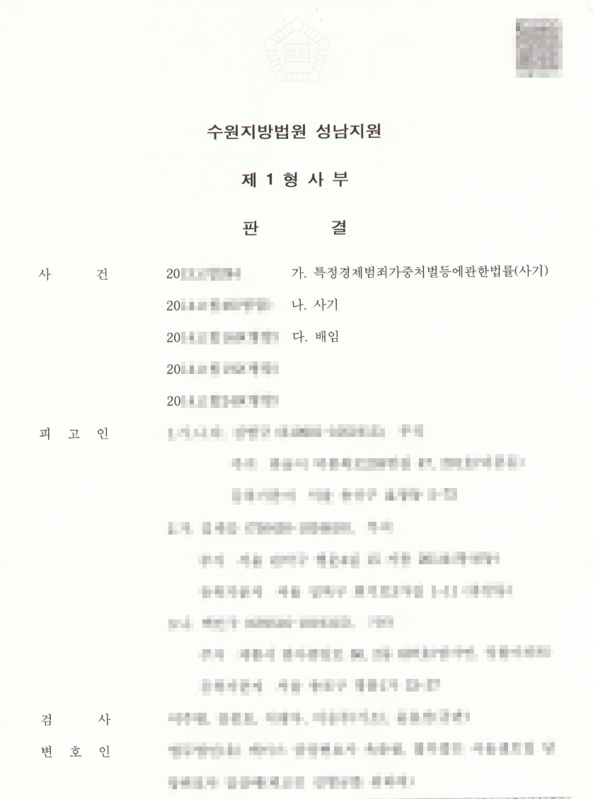 이 사건은 의뢰인이 피해자에게 직접 작성하여 제출한 사기를 범해 미안하다는 내용의 자인서가 문제되는 사안이었습니다. 저는 우선 공범들에 대한 증인신문을 통하여 사실관계를 밝히고, 자백하는 취지의 자인서는 증거능력이 없다는 점을 변론하였습니다.