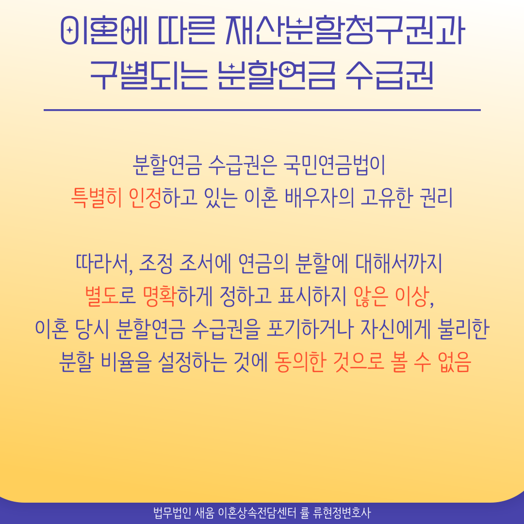 분할연금 수급권은 국민연금법이 특별히 인정하고 있는 이혼 배우자의 고유한 권리로서, 민법이 정하는 이혼에 따른 재산분할청구권과 구별되는 권리입니다. 따라서 조정 조서에 연금의 분할에 대해서까지 별도로 명확하게 정하고 표시하지 않은 이상, 이혼 당시 분할연금 수급권을 포기하거나 자신에게 불리한 분할 비율을 설정하는 것에 동의한 것으로 볼 수는 없습니다. 이혼을 하면서 별도로 위자료나 재산분할을 청구하지 않는다는 내용의 조정조서를 작성했다고 하더라도 여전히 균등한 비율의 분할연금 수급권을 가진 것으로 보는 것이 타당합니다. 연금의 사회보장적인 성격을 고려하면 이와 같은 수급권이 인정되는 면을 이해할 수 있습니다.