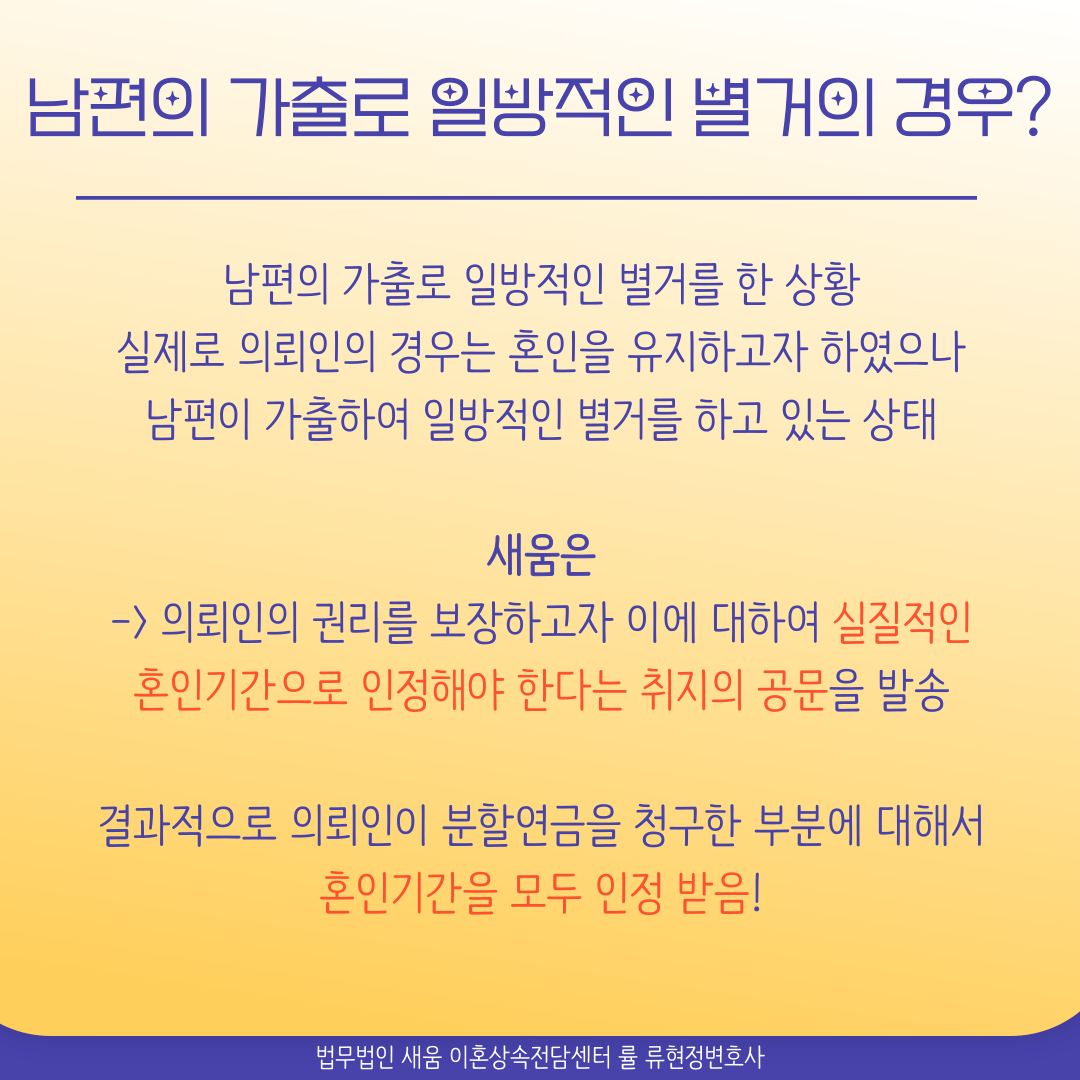 별거 등으로 실질적 혼인관계가 인정되지 않는다면 연금 분할시 그 별거 기간은 포함되지 않는다고 말씀드렸지요. 그런데 이 사안의 경우 남편이 가출로 일방적인 별거를 한 상황이었습니다. 실제로 의뢰인은 혼인을 유지하고자 하였으나 남편이 가출하여 일방적인 별거를 하고 있는 상태였기 때문에, 새움에서는 의뢰인의 권리를 보장하고자 이에 대해 실질적인 혼인기간으로 인정해야 한다는 취지의 공문을 발송하였습니다.