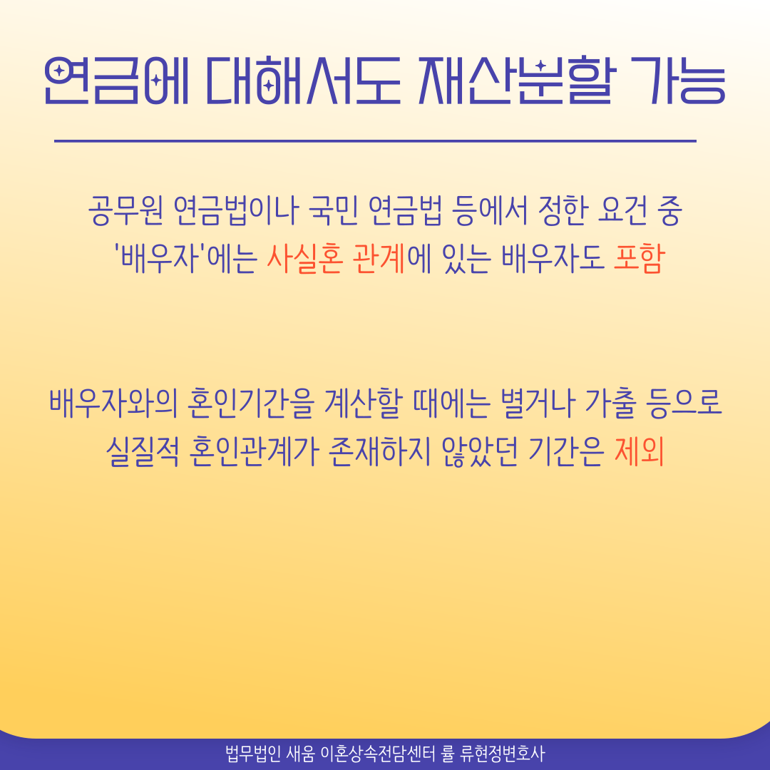 공무원 연금법이나 국민연금법 등에서 정한 요건 중 ‘배우자’에는 사실혼 관계에 있는 배우자도 포함하지만, 배우자와의 혼인기간을 계산할 때에는 별거나 가출 등으로 실질적 혼인관계가 존재하지 않았던 기간은 제외하고 있습니다. 가출이나 별거 등으로 실질적 혼인관계가 없었던 상대방이 그 기간을 모두 포함한 만큼을 분할청구할 경우에 대한 방지책이라고 할 수 있겠지요.