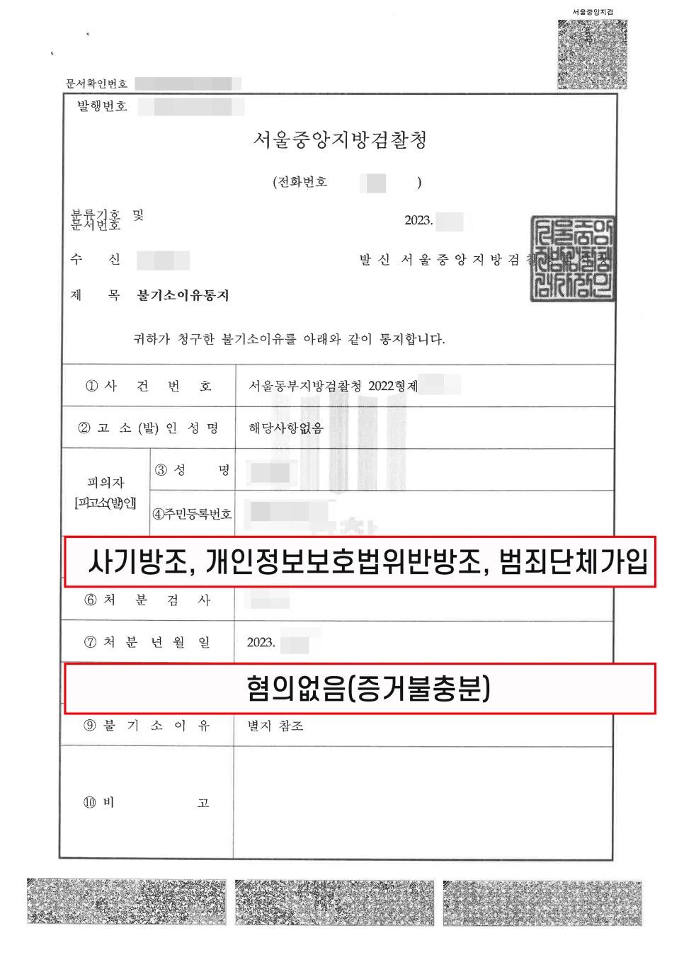 이러한 저의 주장을 모두 받아들여 검찰은 사기방조죄, 범죄단체가입죄, 개인정보보호법위반 방조죄 모두 혐의없음(무혐의)처분을 내렸는데요.