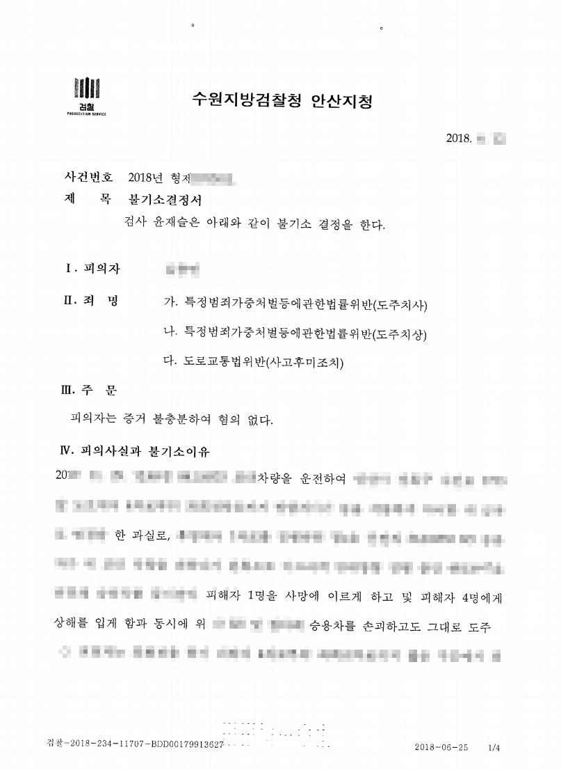 의뢰인은 과시로 1명을 사망에 이르게 하고, 4명의 상해를 입히고 승용차를 손괴하도 도주하였다는 중한 혐의로 수사를 받게 되었습니다. 이에 대해 의뢰인은 사고발생을 인지하지 못하였다고 억울해 하였습니다.