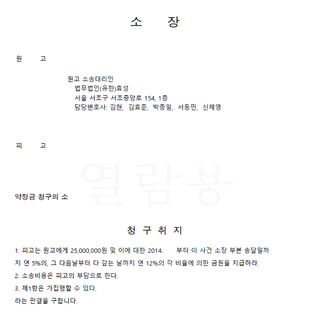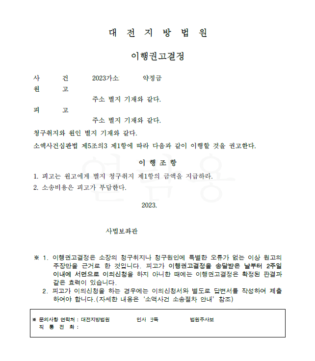저는 즉각 애초의 채권인 약정금이 소멸시효가 도과되지 않음을 확인한 후 민사소송 약정금청구를 하였고 법원은 저희의 주장을 받아들여 이행권고결정을 내려 확정되어 의뢰인은 약정금을 반환받게 되었습니다.