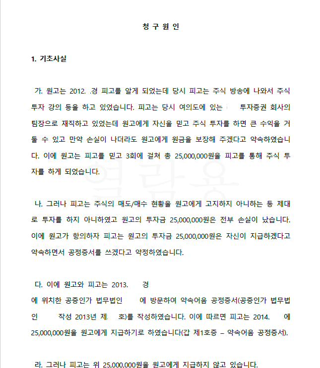 의뢰인은 주식투자증권 회사의 팀장에게 주식 투자를 일임하였으나 팀장의 실수로 전액 손실이 발생하였습니다. 팀장은 의뢰인에게 자신이 투자원금 전액을 변제하겠다고 약속하면서 약속어음 공정증서를 작성하였습니다. 의뢰인은 위 공정증서를 행사하지 않아 약속어음의 소멸시효가 도과된 상태에서 뒤늦게 저를 찾아오셨습니다.
