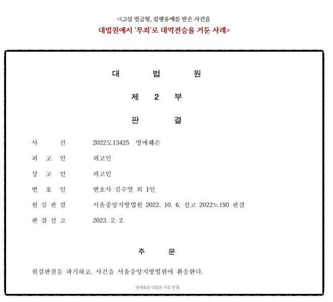 위 판결문은 저희 로펌이 1,2심 유죄 사건을 대법원에서 무죄로 이끌었던 사례입니다.