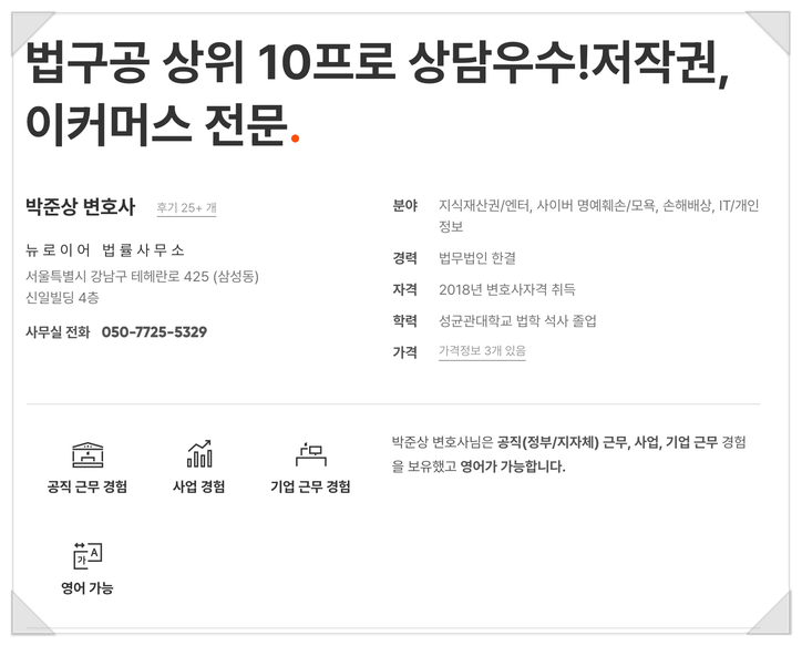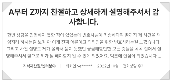 그렇기에 저희는 지식 재산권 변호사 만큼은 그저 인터넷 최상단에 뜨는, 유명세를 가진, 화려한 이력을 가진 등만 보고 섣불리 선택하지 않으셨으면 합니다.