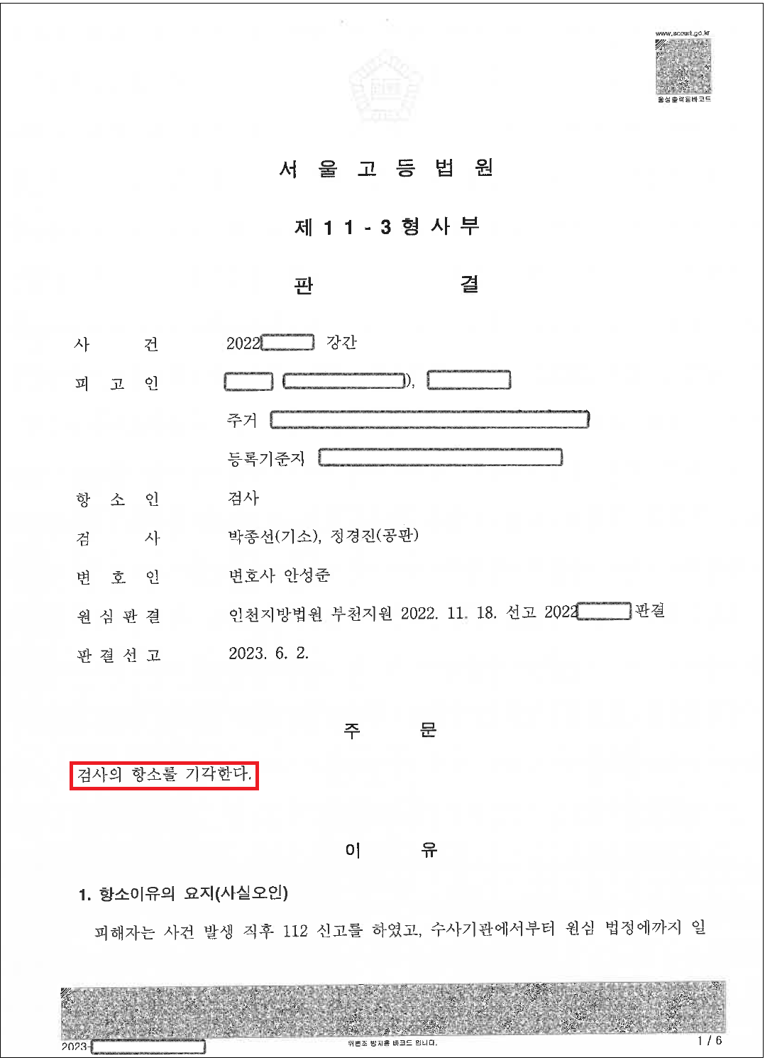 이에 대한 검찰의 항소에 대해서도 검찰의 항소를 기각하고 무죄판결을 확정하는 항소심 판결을 얻을 수 있었습니다.