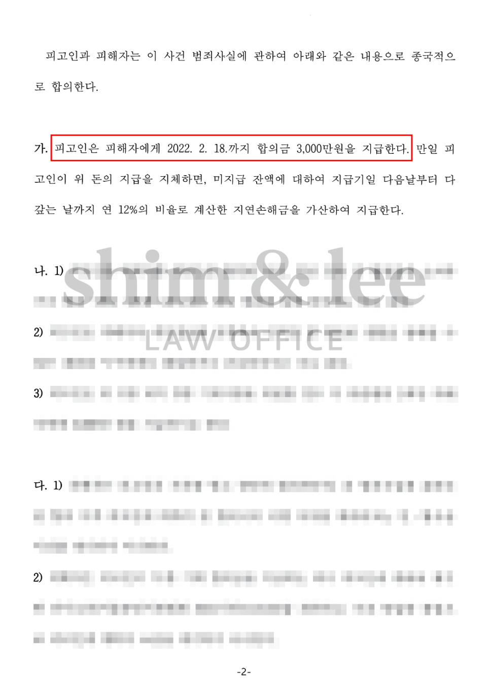 결국 예상대로 가해자는 의뢰인과 합의하지 못했다는 이유로 기소 처분이 내려지자마자 황급히 제안액을 3,000만 원으로 높여왔고, 의뢰인은 처음 목표액보다 훨씬 높은 금액으로 보상받을 수 있었습니다.