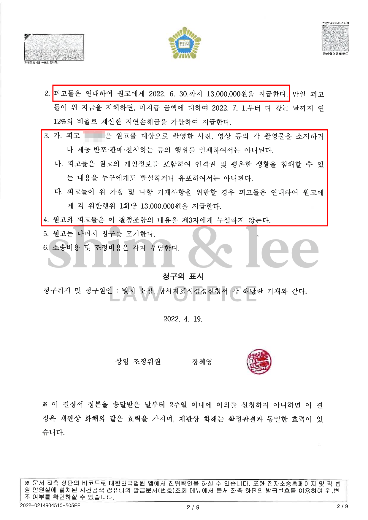 또한 피해자를 위하여 유포 금지 및 비밀 유지와 추가적인 손해배상책임까지 결정사항에 명시해주기까지 했습니다.
