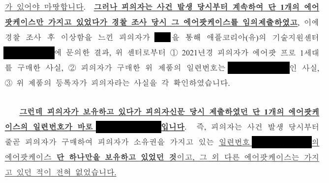 그런데 경찰 조사 이후 피의자 측에서 애플코리아(유)에 문의한 결과 '위 에어팟케이스의 일련번호'가 '피의자가 2021년경 구매한 에어팟케이스'의 일련번호와 완전히 동일한 것이었던 것을 확인하였기에, 저 이재성 변호사는 "사건 발생 당시부터 경찰 조사 때까지 피의자가 보유한 에어팟케이스는 피의자 소유의 에어팟케이스 단 하나이고, 피해자 소유의 에어팟케이스를 가지고 있던 적은 없다"는 주장을 강력하게 개진하였습니다.