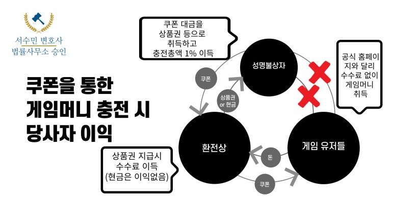 이와 관련된 사례를 소개하려고 합니다. 일단 게임회사로부터 게임머니 쿠폰 발급의 권한을 받은 성명불상의 자로부터 해당 쿠폰을 구매한 환전상이 이를 게임 유저들에게 판매하여 수익을 얻을 경우, 게임 유저들은 지불하는 현금과 동일한 가치를 가지는 게임머니를 획득하게 됩니다.