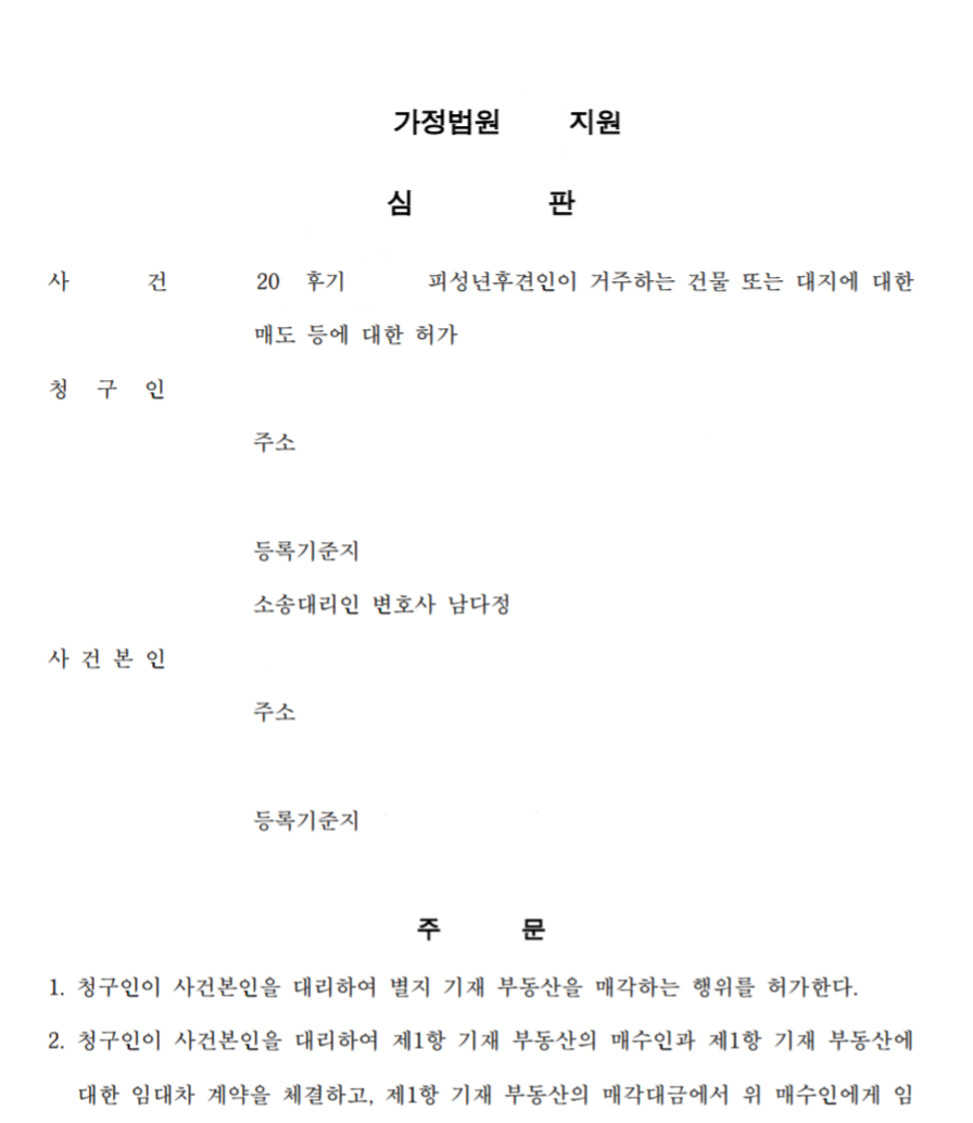 만약 부동산 처분, 사용에 대해서 가족분들 사이에 분쟁이 있더라도 그 처분, 사용이 피후견인을 위해서 반드시 필요하다면 법원에서 허가를 받을 수 있기 때문에 분쟁이 있더라도 부동산의 처분, 사용이 꼭 필요하시다면 고민만 하지마시고 변호사와 상담을 받아보시기를 바랍니다.