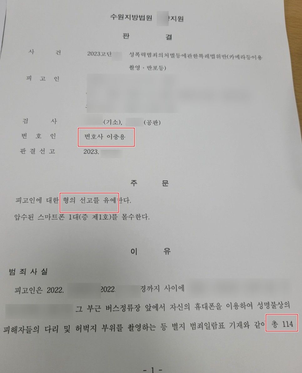 카메라등이용촬영죄 자체가 성범죄에 속하는 사건으로 중한 사건이기도 하고, 촬영횟수가 114회로 굉장히 많았기 때문에 선고유예 처분을 기대하지는 않았는데, 이렇게 선고유예 처분이 나와 저도 굉장히 만족스러웠던 사건이었습니다.