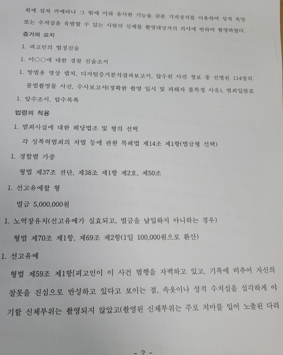 이에 반하여 검사님은 촬영횟수(114회)가 굉장히 많고, 피해자들과 합의가 되지 않아 피해회복이 이루어지지 않은 점, 재범의 위험이 굉장히 높은 점 등을 주장하시며 징역 2년을 구형하셨습니다.