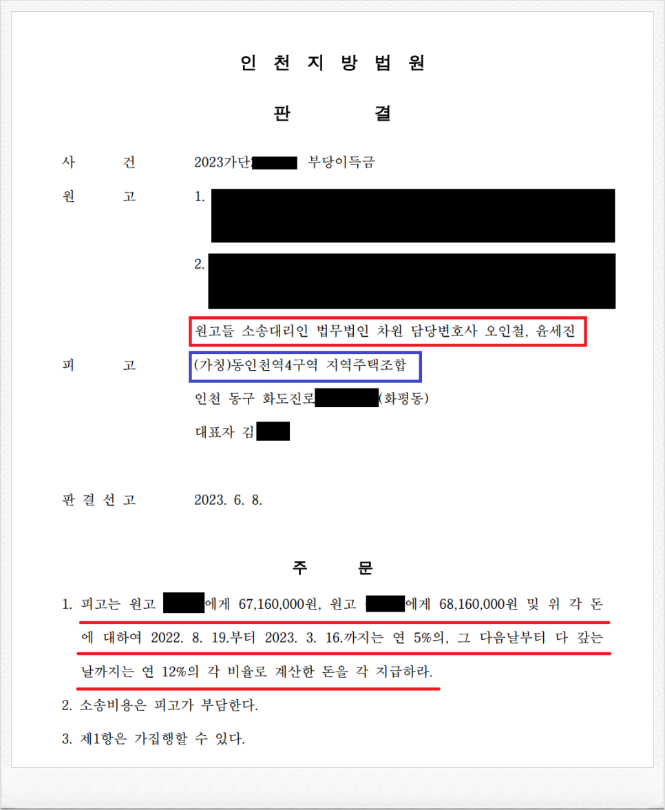 결국, 재판부는 이러한 저의 주장을 받아들였고, 피고는 의뢰인들에게 기지급 받은 금원 및 이에 대한 지연손해금을 지급하라는 내용의 판결을 이끌어 내었습니다.