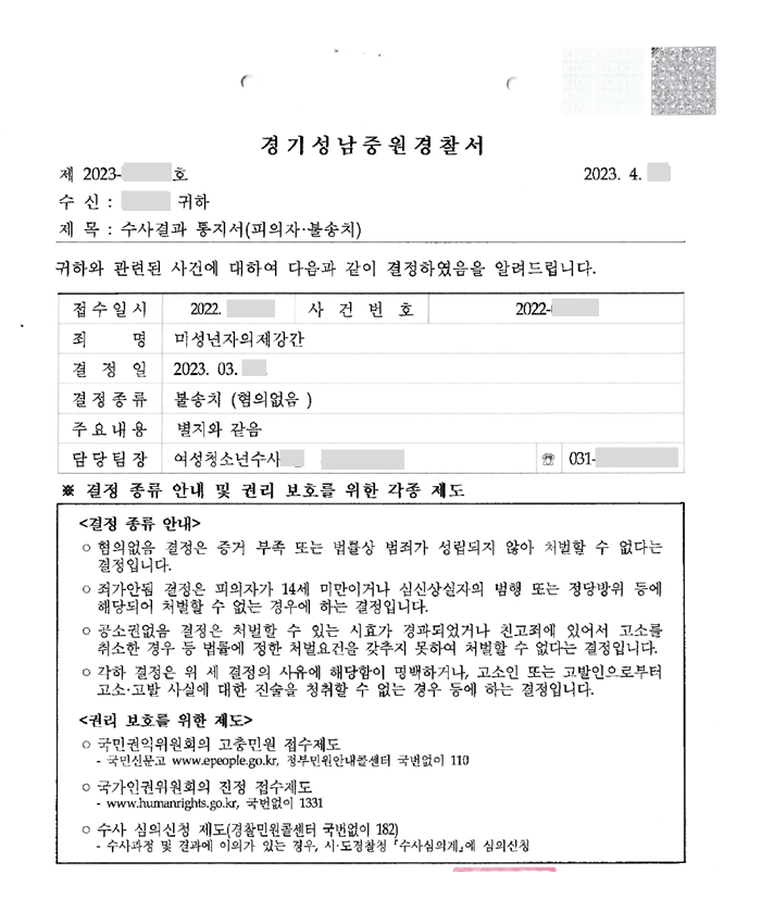 이에 의뢰인은 혐의 없음을 인정 받아 불송치 결정을 받게 되었습니다.