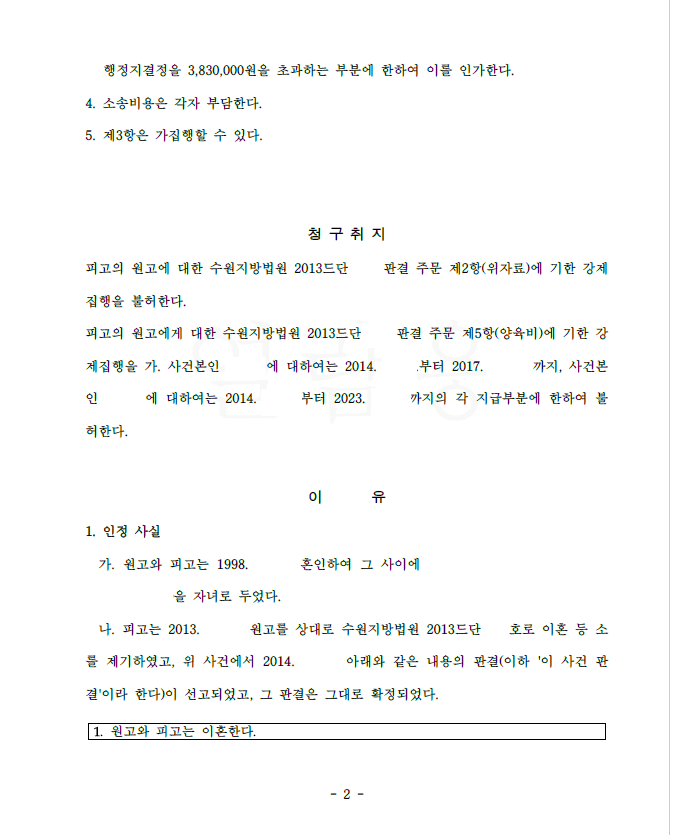 의뢰인은 피고와 이혼하였고 자녀들의 양육권은 피고에게 주어졌으며 재산분할 및 위자료 지급도 모두 마무리되었는데, 피고는 자녀들을 학대하여 분리조치가 이루어졌습니다. 그런데 피고는 의뢰인이 위자료 및 양육비를 지급하지 않는다며 이혼판결문을 집행권원으로 하여 강제집행을 개시하였고 의뢰인을 즉시 저를 찾아오셨습니다.
