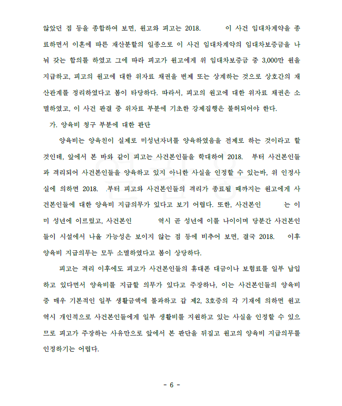 저는 즉각 청구이의의 소를 제기하여 위자료는 모두 지급이 완료되었고, 양육비는 피고가 학대하여 분리조치가 이루어졌으므로 의뢰인이 양육비를 피고에게 지급할 의무가 없다고 주장 입증하였고 법원의 저희의 주장을 받아들여 원고 승소 판결을 선고하였습니다.