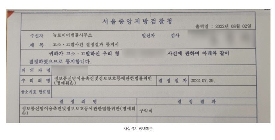의뢰인분은 과거 작성한 게시글로 인해 명예훼손죄로 기소되어 법원에서 재판을 받고 있었는데요. 의뢰인분에 대한 판결이 선고된 후 의뢰인을 익명화한 기사가 나오기도 했습니다.