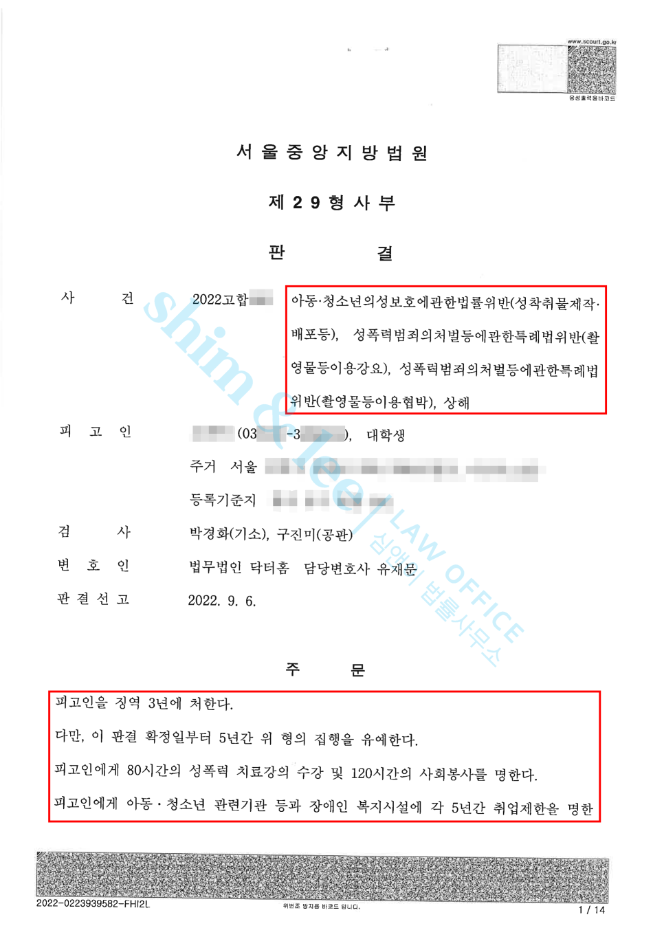 결과적으로 가해자는 선처를 받기는 했지만 무려 5년의 집행유예와 취업제한, 총 200시간의 교육명령을 선고받았습니다.