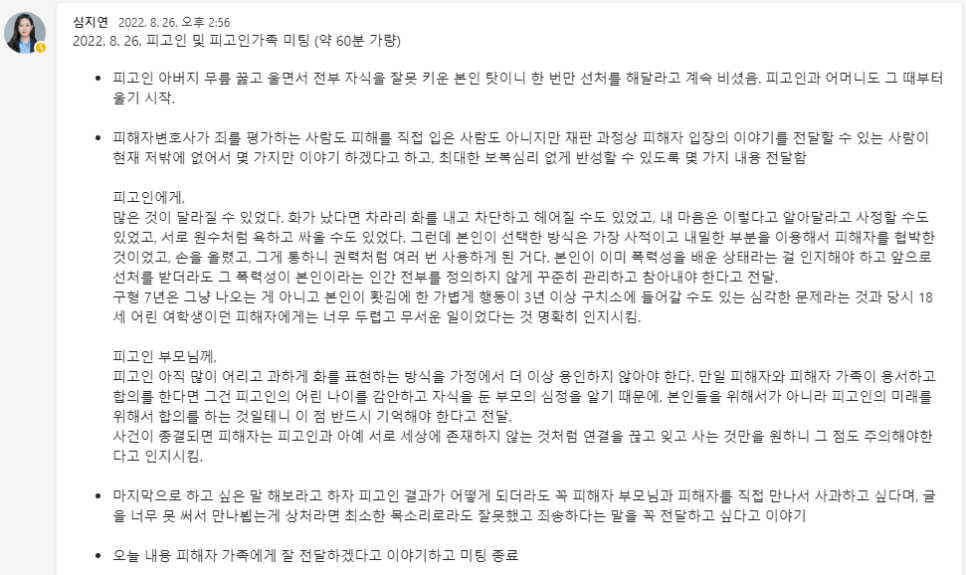 그러나 심지연 변호사는 그냥 쉽게 합의해주면 용서의 의미가 퇴색될 것이라고 생각해서, 선고기일을 앞두고 가해자와 부모들을 심앤이 사무실로 불러서 1시간 동안 직접 훈계했습니다. 어린 가해자에게 본인이 저지른 범죄들이 우리 사회가 얼마나 심각하게 바라보고 있는 범죄인지, 이대로 합의 없이 처벌을 받게 되면 아무리 어려도 최소 3~4년 이상 강도 높은 실형으로 법정에서 구속된다는 것을 하나하나 가르치고 이해시켰습니다. 또한 본인에게 내재된 폭력성을 스스로 다스려야 하고, 앞으로 다시는 같은 범죄를 저지르지 않도록 이 일을 계속 되새기고 반성하면서 살아가야 한다고 훈계했습니다.