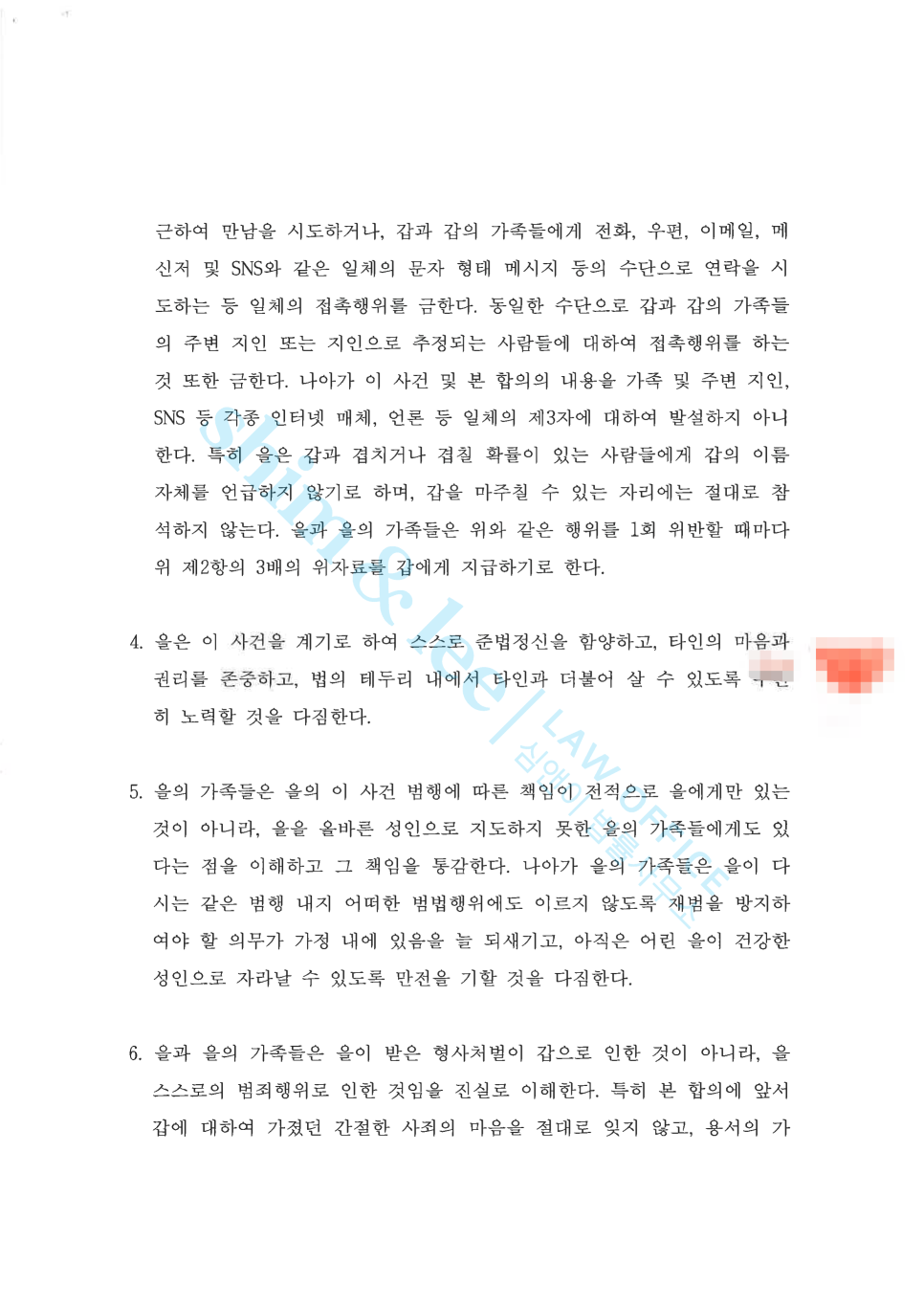 그리고 합의서에서도 2차 가해를 막는 조항과 가해자의 의무사항을 자세히 써서 가해자가 스스로 반성하고 잘못을 되새길 수 있도록 합의 과정 자체에 큰 의미를 담았습니다.