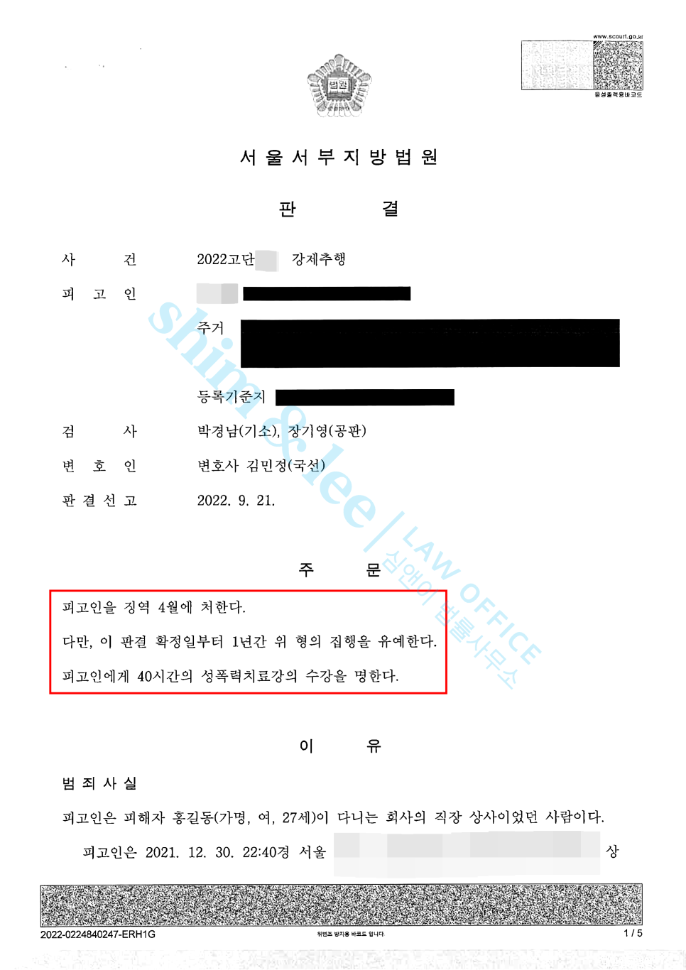 다행히 술집 CCTV에 추행 장면이 찍혀서 가해자는 자백할 수밖에 없었습니다. 회사에서는 가해자를 직장 내 성추행으로 곧바로 해고했습니다. 피해자는 회사를 계속 다니며 버텨보려고 했지만, 가해자와 비슷하게 생긴 남자만 지나가도 소스라치게 놀랄 정도로 일상생활조차 어려워서 결국 퇴사할 수밖에 없었습니다. 직장 내 성추행을 당하면, 실제로 피해자들은 트라우마 때문에 대부분 회사를 그만두게 됩니다. 피해자는 추행을 당한 것도 괴로운데 어렵게 들어간 직장까지 그만둬야 한다는 사실이 너무 억울하고 분했습니다.