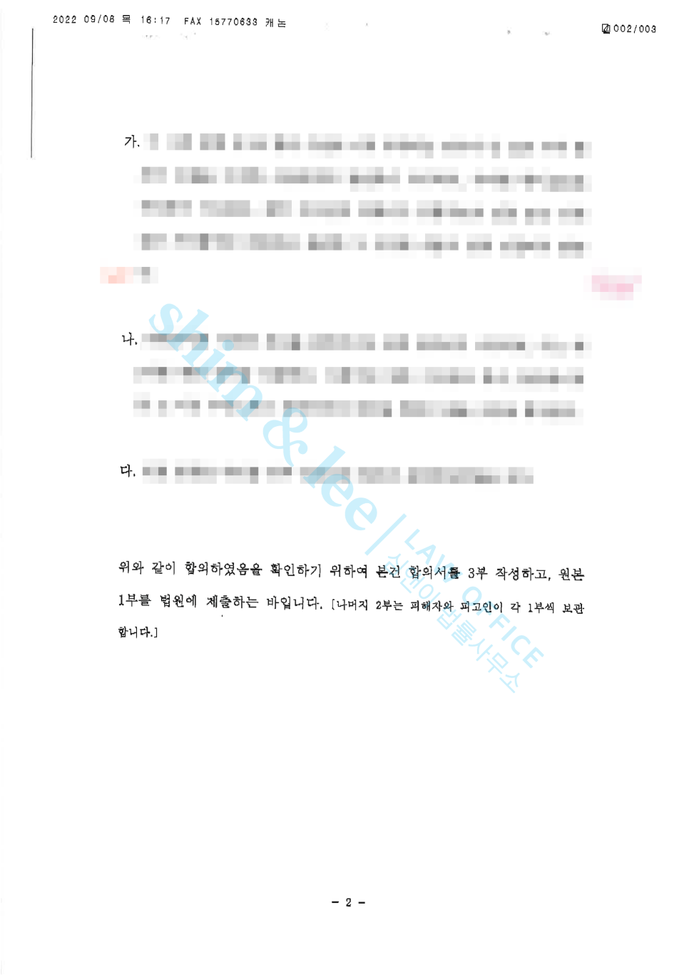 피해자는 합의금 액수에 정말 만족하셨습니다. 특히 검찰단계에서 적은 돈으로 쉽게 끝나버리고 가해자도 제대로 처벌받지 않는 상황에서, 심앤이와 함께 재판까지 사건을 끌고 가서 합의금을 높이고, 가해자도 훨씬 경각심을 갖고 피해자에게 제대로 사과하도록 만들었다는 결과에 위로를 받으셨습니다.