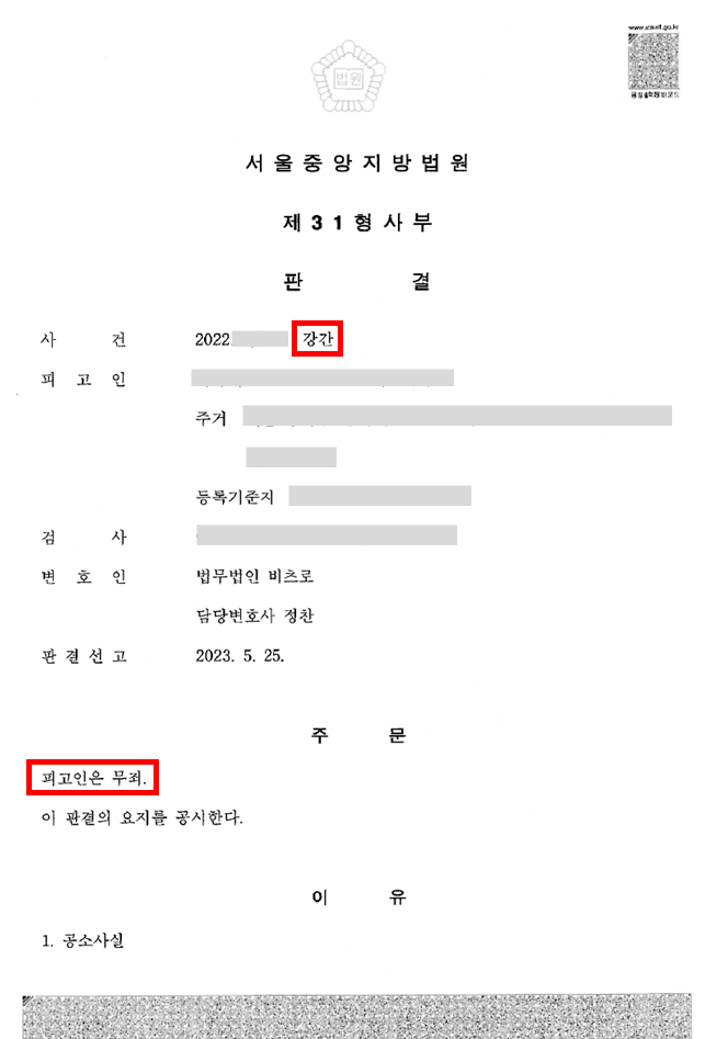 이에 의뢰인은 무죄를 선고 받았습니다.