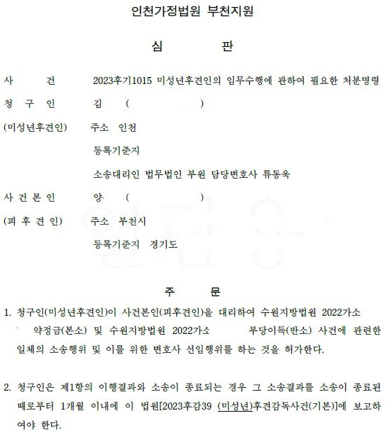 이 사건은 미성년자의 모(미성년자의 부는 이미 사망)가 이미 소송 진행 중 사망을 하였고, 미성년자의 모의 유일한 상속인 미성년자만 있는 상황이었습니다. 소송은 수계를 위해 중단 되었고, 미성년자는 후견인 선임 청구를 하여 후견인이 선임되었습니다. 후견인은 위 소송에 필요한 소송행위 허가 및 변호사 선임 행위에 관하여 법원에 청구를 하였습니다. |