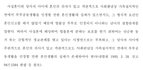 사실혼이란 주관적으로 당사자 사이에 혼인의 의사가 있고, 객관적으로 사회 관념상 가족 질서적인 면에서 부부 공동생활을 인정할 만한 혼인 생활의 실체가 있는 경우를 말합니다. 사실혼은 혼인신고만 안 했을 뿐 실제로 부부가 되려는 합의와 부부 생활이 있어야 하기 때문에 단순한 남녀 간 동거와는 다른 개념입니다. 사실혼 관계를 입증하는 방법에서는 혼인식을 거행하였느냐 여부, 상대방의 가족들과 지속적인 만남이나 교류가 있었는지 여부 등 종합적인 요소가 고려되어야 할 것입니다. 제 사건은 아니였지만, 사실혼이라 주장하는 사람의 이름이 상대방의 모친 묘비에 '사위 000'라고 기재된 경우가 있었다고 합니다. 그 사건은 어떤 판단을 받았을지 궁금합니다. 사실혼관계도 법적 보호를 받을 수 있기 때문에 재산분할을 해야겠죠. 그러나 사실혼에 대한 입증이 쉬운 것이 아닙니다. 주관적으로 혼인의사가 있었느냐, 객관적으로 부부공동생활을 인정할 실체가 있었느냐, 이런 개념을 충족할 사실관계가 입증이 될 수 있는지 어려운 문제점이 발생하는 것이죠. |