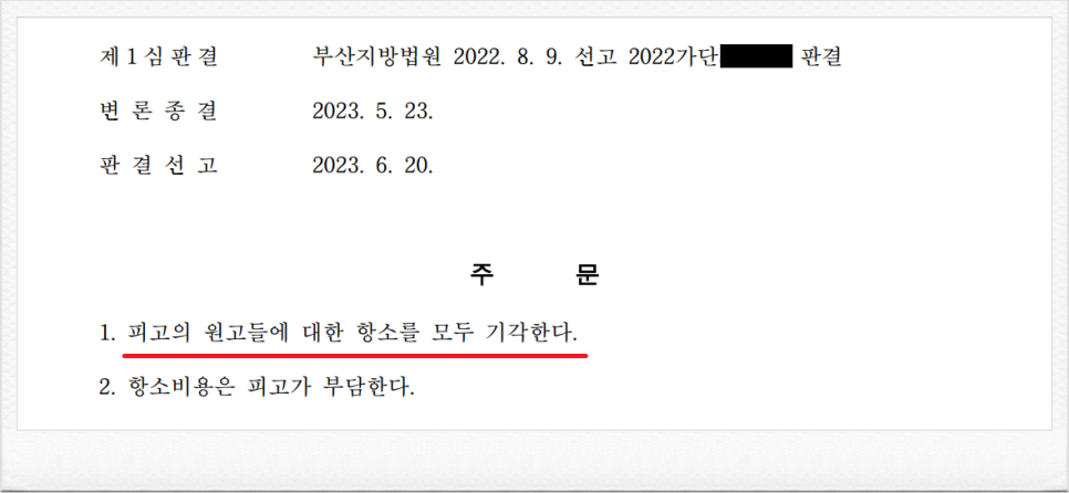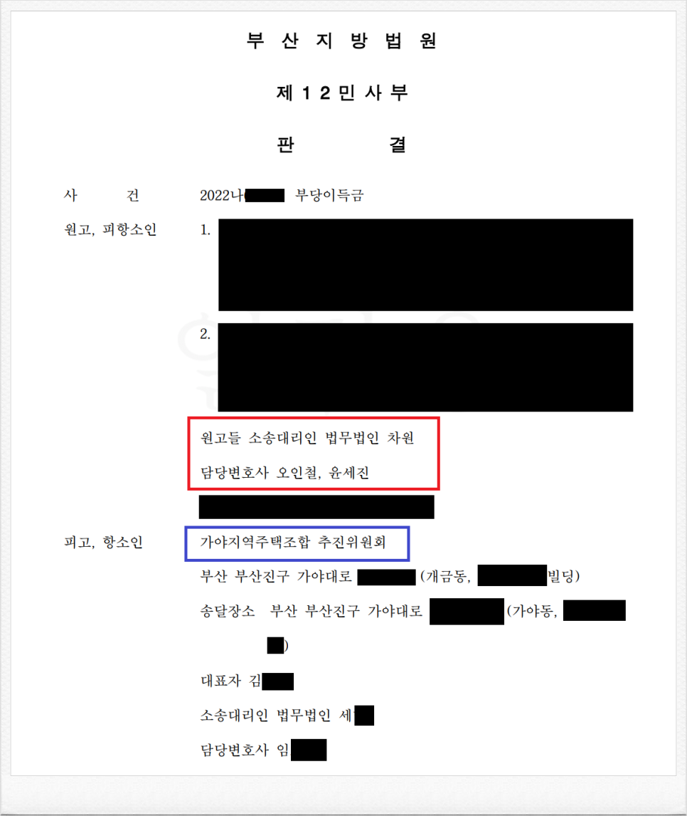 이번에도 재판부는 저의 주장을 받아들여, 제1심에서의 사실인정과 판단은 정당한 것으로 인정됨을 그 이유로하여, 가야지역주택조합 추진위원회 측의 항소를 기각하였습니다.