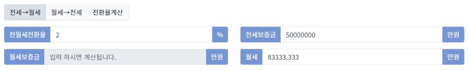만약 월차임 없이 전세보증금만 있었다거나, 반전세와 같이 월차임과 보증금이 같이 있었다면, 보증금은 월차임으로 환산하여 계산해야 합니다. 현재 주택임대차보호법 시행령은 월차임 전환 시 산정률을 2%로 정하고 있으므로, 예를들어 전세보증금 5천만원은 아래와 같이 월차임 83,333원으로 환산됩니다.