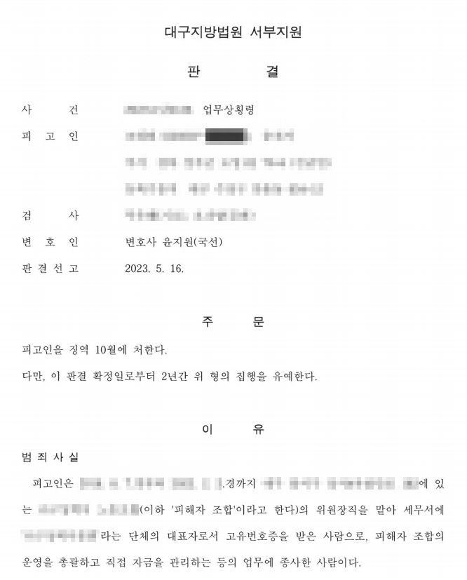 변호인은 형태를 바꾼 현재 회사 이사장의 탄원서를 작성받아 재판부에 제출하였고, 대구광역시 해당 업체 현황 등을 통해 해당 회사가 청산된 것은 아니었지만 실질적으로 폐업했으며, 해당 회사의 근로자들로 구성된 노동조합(피해자 조합)이 목적 달성 불능으로 해산되었다는 점을 설명하였습니다. 이미 피해자 조합이 해산된 상태이므로 누구와 합의를 해야 할지 애매했습니다. 사업비와 교부금을 지급한 상위단체와 합의를 할지 고민하였으나, 조합 해산 직전의 조합원 명부, 퇴사자 명부 등을 통해 조합 해산 직전의 조합원이 누구인지 특정하고, 해산 당시의 조합원들에게 조합재산이 배분되는 것으로 보아 실질적인 피해자가 누구인지 재판부에 설명하면서 조합 해산 직전의 조합원들과의 합의서를 제출하였습니다.