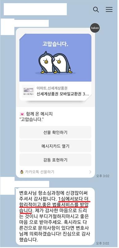 이에 의뢰인 역시 김나리 변호사의 조력에 100%만족하였고, 선고결과가 나오는 날 아래와 같이 감사 인사를 보내왔습니다.
