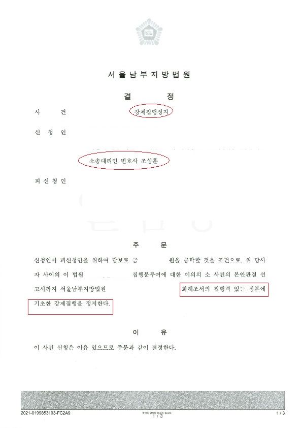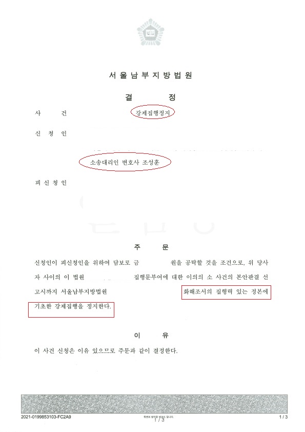 저희 법률 사무소는 위 사건을 수임받자마자 법원에 강제집행정지를 신청하고