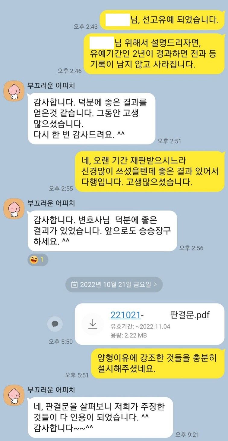 <해당 사건의 실제 판결문과 의뢰인의 감사인사 입니다>