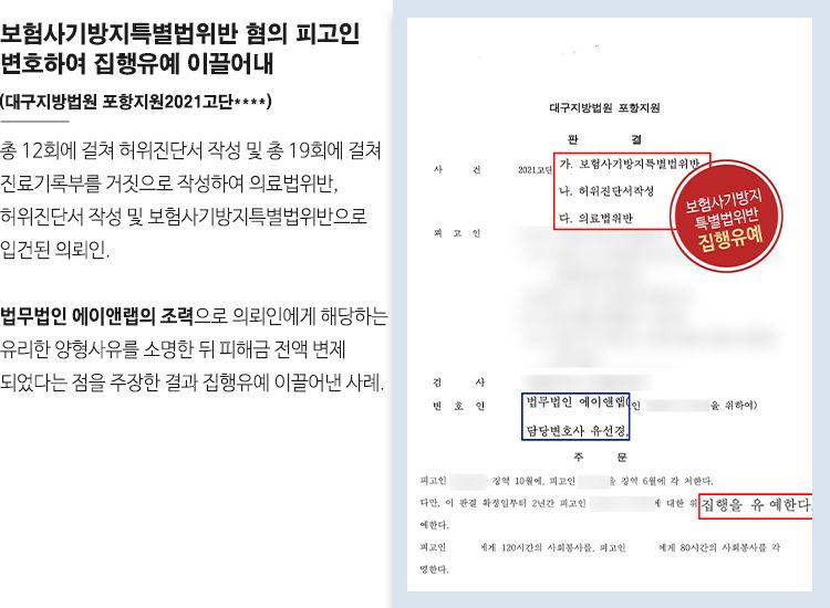 그 결과 대구지방법원 포항지원은 이러한 유선경 변호사의 주장을 인정하였고 집행유예 판결을 내렸습니다. 이로써 의뢰인은 다시 일상으로 돌아갈 수 있게 되었습니다.