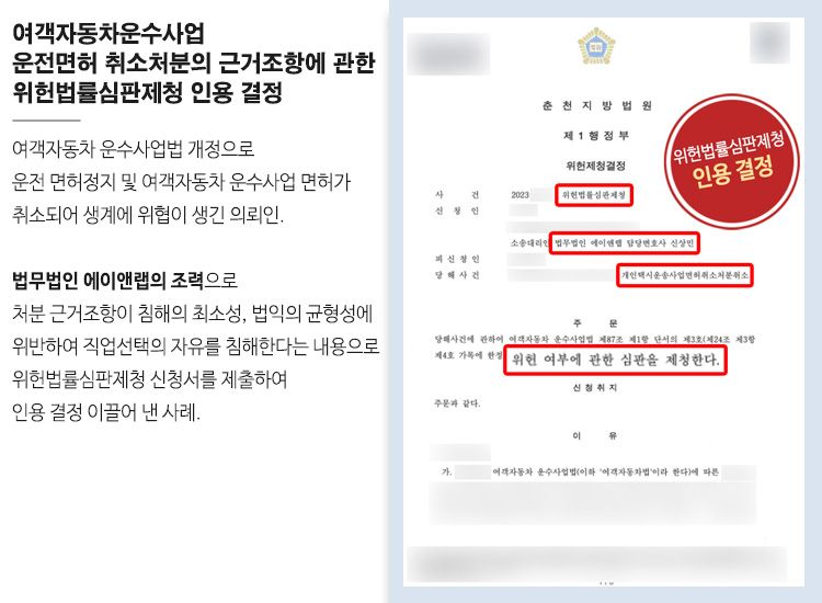 이에 사건을 담당한 춘천지방법원은 신상민 변호사의 신청 내용을 그대로 받아들여 위헌법률심판제청을 하게 되었습니다. 이와 같은 결과로 이후 법원이 위헌법률심판제청을 하게 되면 이 심판대상조항에 대해 헌법재판소가 위헌 여부를 심사하게 되며, 향후 헌재의 위헌 판결이 있다면 의뢰인은 취소소송에서도 승소할 수 있는 가능성을 가지게 되었습니다.