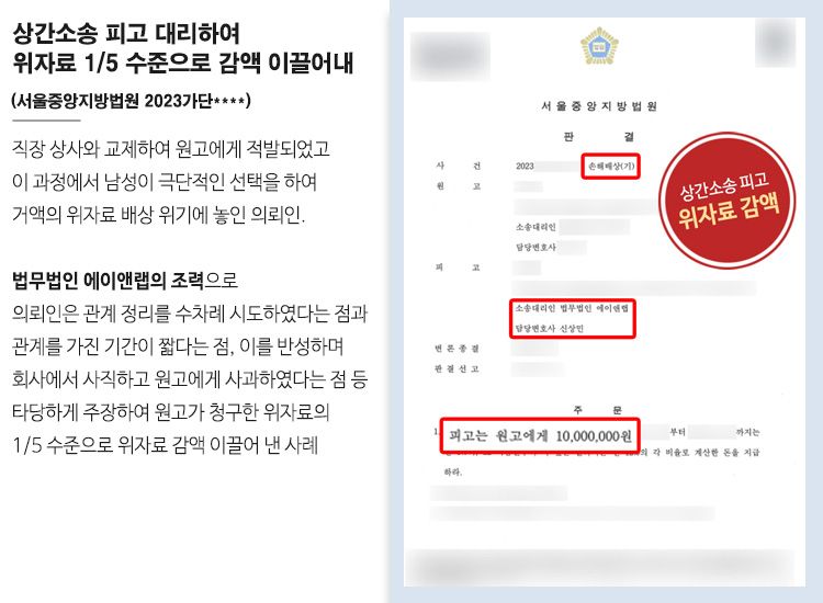 이에 사건을 담당한 서울중앙지방법원에서는 이와 같은 신상민 변호사의 주장을 인정하였고, 기존 청구금액인 5천만원에서 1/5 수준으로 감액된 1천만원만 원고에게 지급하라는 판결을 내려주었습니다. 이로써 의뢰인은 막대한 위자료를 지급해야 할 위기에서 벗어날 수 있었습니다.