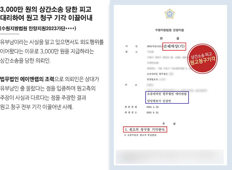 이로써 의뢰인은 자칫 억울하게 상간녀라는 꼬리표와 막대한 위자료를 지급해야 할 위기에서 벗어나 일상으로 돌아갈 수 있게 되었습니다.