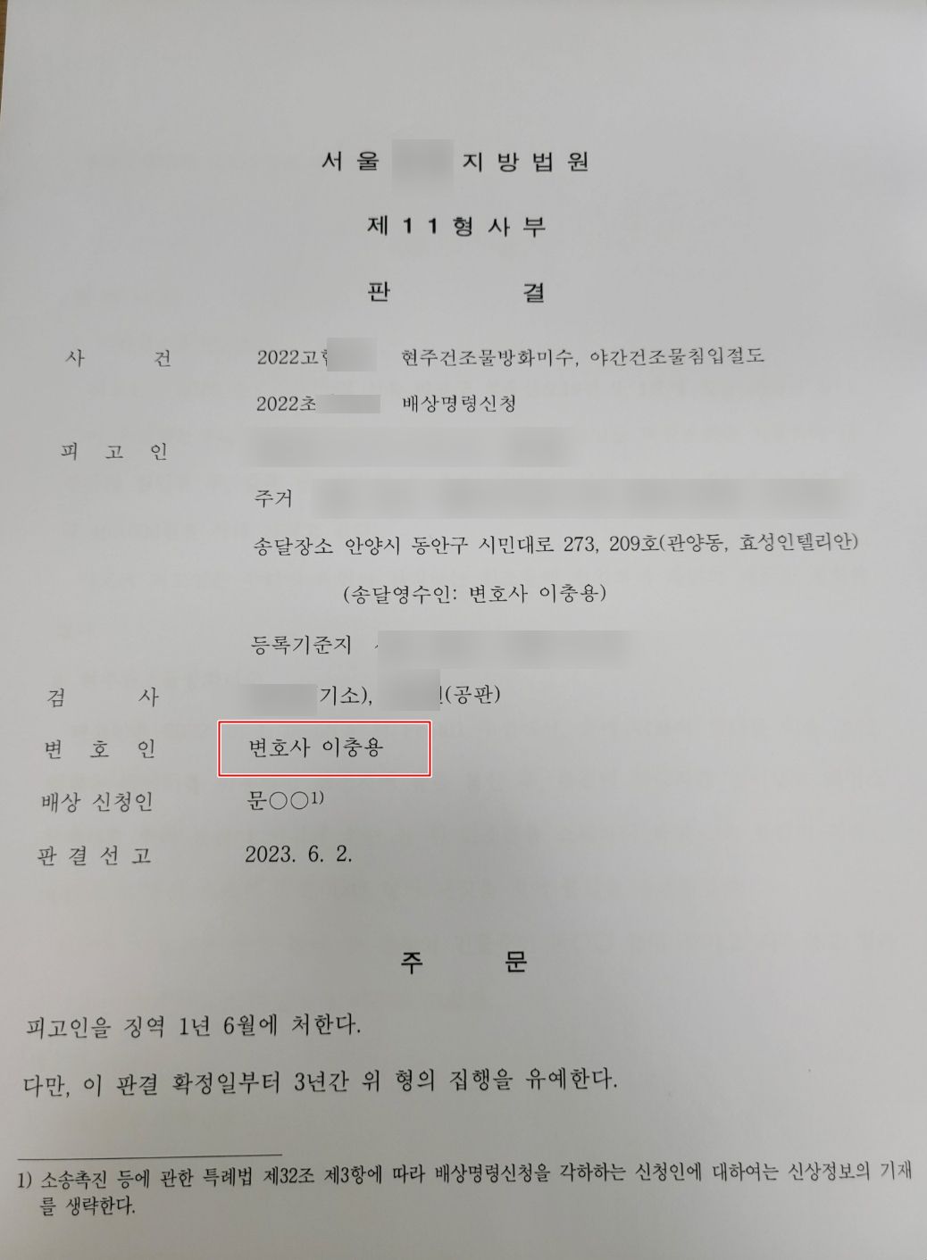 야간주거침입절도, 현주건조물방화미수 범행이 워낙 중한 범죄이기도 하고 피해자와 합의에 이르지 못했기 때문에 집행유예 판결을 받을 것이라 확신할 수 없었지만, 결과적으로 집행유예 판결을 받을 수 있게 되어 매우 뿌듯했던 사건이었습니다.