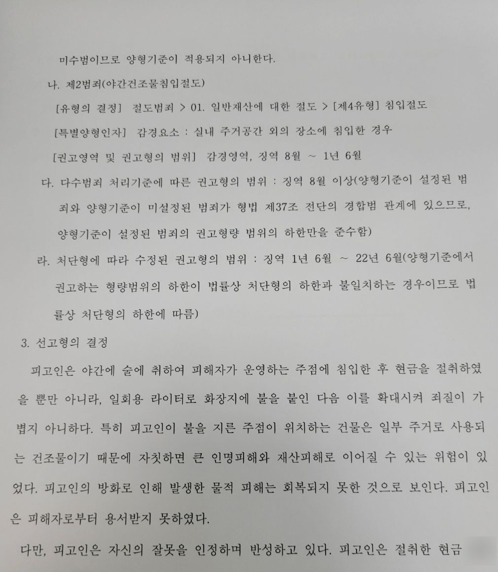 이후 우리 의뢰인의 양형자료를 수집한 후 의뢰인이 20대의 청년이고 자백하며 우발적으로 이 사건 범행을 저지른 점, 절취한 현금은 모두 피해자에게 돌려준 점, 의뢰인이 스스로 화재를 진압한 점 등을 잘 정리하여 변호인의견서를 작성하여 법원에 제출하였습니다.
