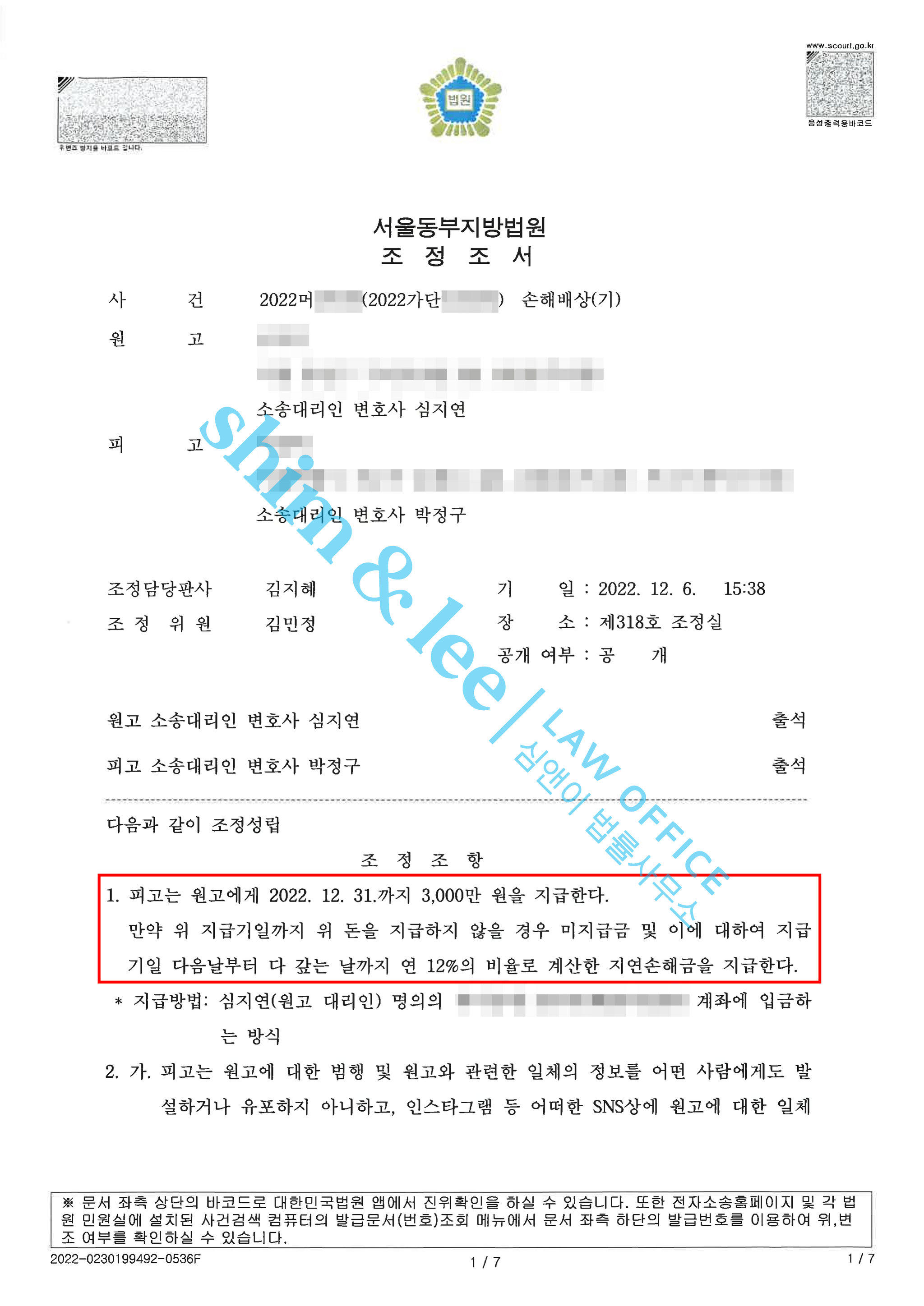 민사 조정에서의 치열한 공방 끝에 심앤이는 가해자에게 3,000만 원의 손해배상액을 받아낼 수 있었습니다. 피해자가 요청했던 발설 및 유포금지, 연락 및 접근 금지 등의 조항까지 전부 포함해 조정을 성립시켰습니다.