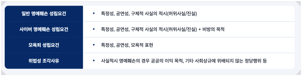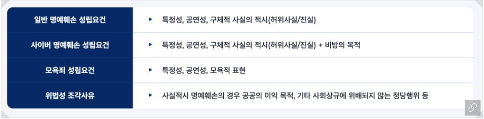 모욕죄, 명예훼손 성립요건은 아래와 같습니다.